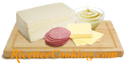 Disporre un rettangolo di pane su un foglio di carta da forno ed appiattirlo delicatamente con il matterello per renderlo piu' compatto. Spalmarvi uniformemente meta' della crema ai carciofini preparata, quindi distribuirvi 4 fette di sottilette e coprire il tutto con la meta' delle fettine di salame.