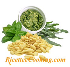 Lessare la pasta in abbondante acqua salata, quindi scolarla trasferendola in un piatto di portata; condirla con il pesto preparato ammorbidendola eventualmente con un po' d'acqua di cottura tenuta da parte e completare con la ricotta a fiocchetti.