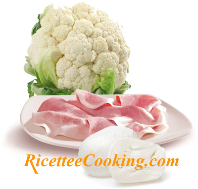Condire il cavolfiore con l'olio, una spolverata di pepe ed aggiungervi la mozzarella tagliata a cubetti ed il prosciutto cotto ridotto a listarelle.