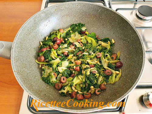 Eliminare l’aglio ed il peperoncino ed aggiungere le olive, i capperi ed i pinoli. Lasciare insaporire un minuto ed unire quindi la scarola scolata. Chiudere con un coperchio e lasciare appassire per qualche minuto, con la propria acqua di vegetazione, mescolando di tanto in tanto.